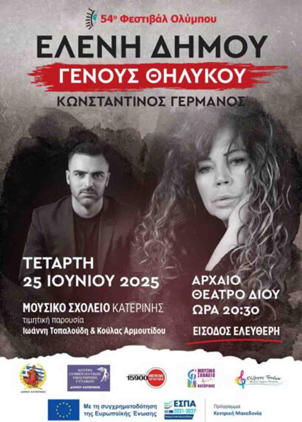 Το Μουσικό Σχολείο Κατερίνης συναντά την αγαπημένη ερμηνεύτρια Ελένη Δήμου, σε μία μοναδική συναυλία… ΓΕΝΟΥΣ ΘΗΛΥΚΟΥ. Ο τραγουδοποιός, Κωνσταντίνος Γερμανός, με καταγωγή από την Κατερίνη, με αφορμή τη γυναικοκτονία που συγκλόνισε την Ελλάδα και με σεβασμό στη φωνή κάθε γυναίκας, τιμά τη μνήμη της αδικοχαμένης Ελένης Τοπαλούδη.