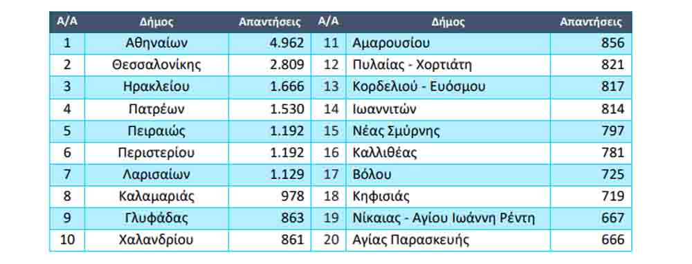 Οι δήμοι με τις περισσότερες απαντήσεις είναι ο Δήμος Αθηναίων με 4.962 απαντήσεις, ο Δήμος Θεσσαλονίκης με 2.809 απαντήσεις, ο Δήμος Ηρακλείου Κρήτης με 1.666 απαντήσεις, ο δήμος Πατρέων με 1.530 απαντήσεις και οι δήμοι Πειραιά και Περιστερίου με 1.192 απαντήσεις έκαστος.(πίνακας)