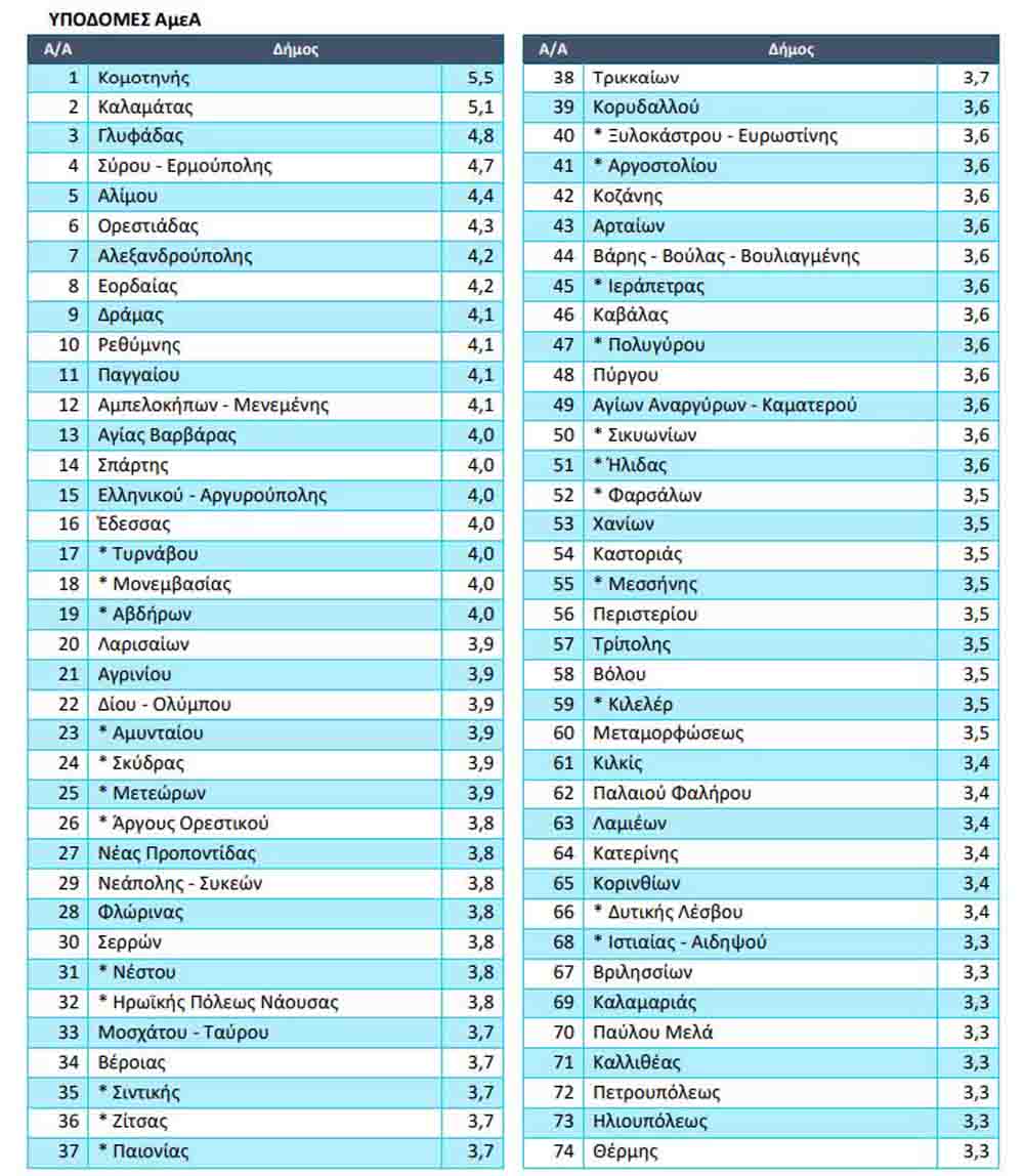 “Κορυφαίος” δήμος είναι της Γλυφάδας αλλά με βαθμολογία μόλις 5,4 στα 10 (δηλαδή, λίγο πάνω από τη βάση), δεύτερος ο Δήμος Αλίμου (5,2)  και στην τρίτη θέση, οριακά πάνω από τη βάση (5,1), ισοβαθμούν οι Δήμοι Μετεώρων, Καλαμάτας, Καστοριάς και Ελληνικού-Αργυρούπολης. Έβδομος ακριβώς πάνω στη βάση (5) κατατάσσεται ο Δήμος Άργους Ορεστικού, ενώ την δεκάδα με βαθμολογίες κάτω από τη βάση συμπληρώνουν οι Δήμοι Τυρνάβου, Δίου – Ολύμπου (4,8) και Περιστερίου (4,7). Στα 4,7 βρίσκονται ακόμη τέσσερις δήμοι: Αμπελοκήπων Μενεμένης (δήμαρχος ο πρόεδρος της ΚΕΔΕ), Λαρισαίων, Έδεσσας και Κοζάνης.