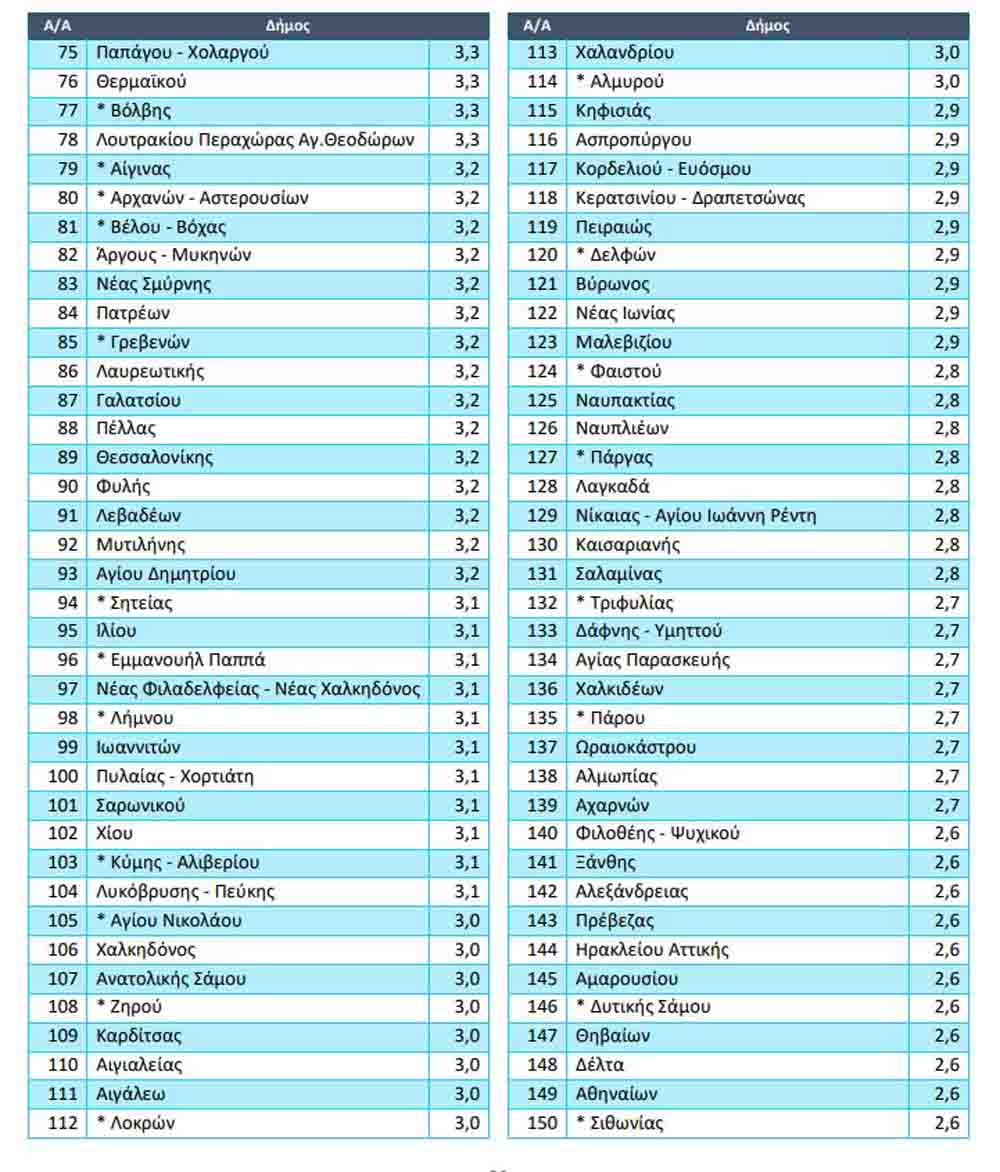 Οι κατάταξη αξιολόγησης των 184 Δήμων (πίνακες)