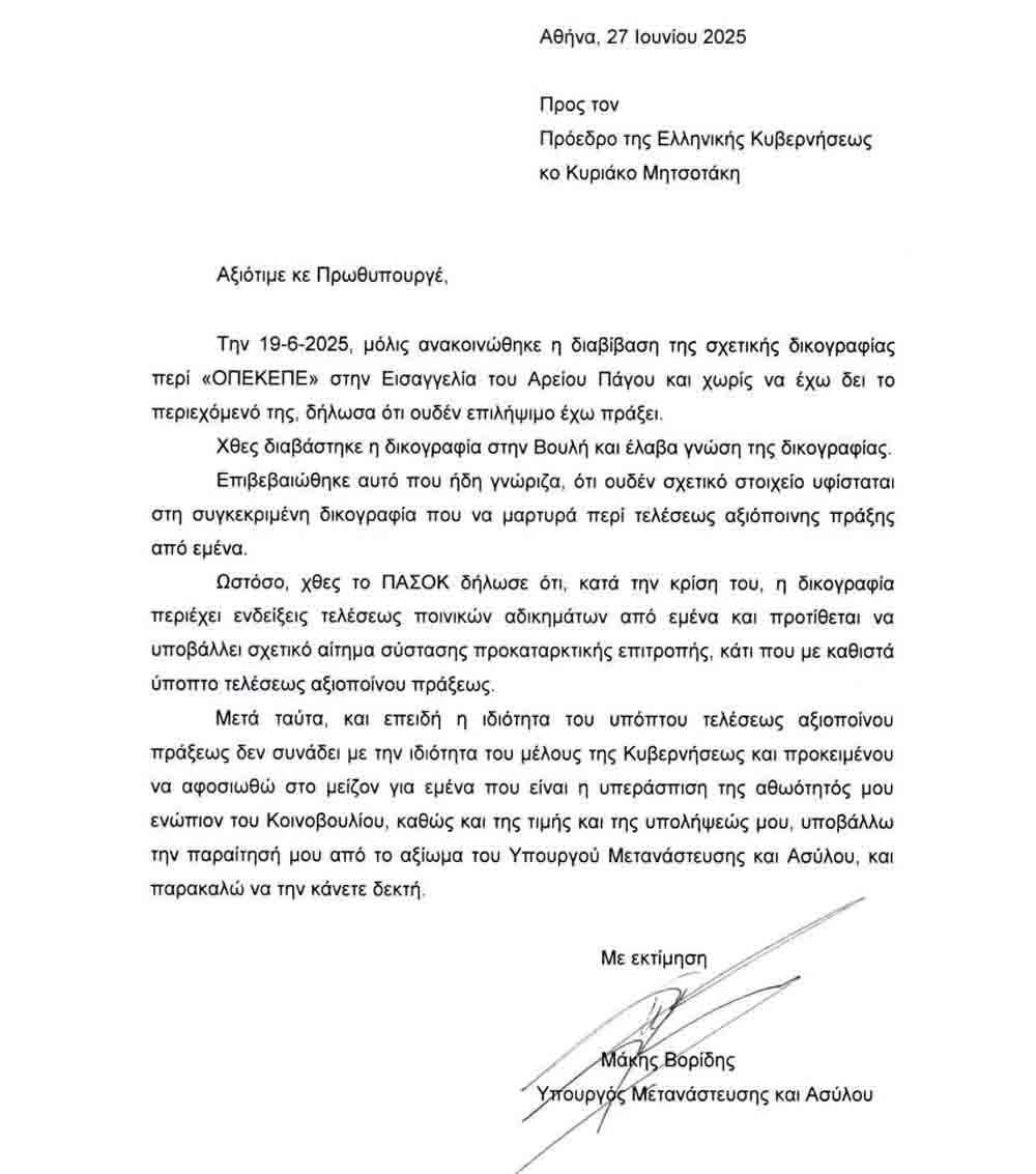 Στην ανακοίνωσή του ο κυβερνητικός εκπρόσωπος αναφέρει: «Ανακοινώνεται ότι ο Υπουργός Μετανάστευσης και Ασύλου Μάκης Βορίδης υπέβαλε την παραίτησή του στον Πρωθυπουργό, για τους λόγους που αναφέρονται στην επιστολή και η οποία επισυνάπτεται. Ο Πρωθυπουργός έκανε δεκτή την παραίτησή του.