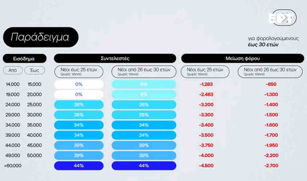 - Ενίσχυση της νέας γενιάς, με στόχο τη μείωση της ανεργίας στις μικρές ηλικίες. Για παράδειγμα, για εισόδημα έως 20.000 ευρώ και άτομα έως 25 ετών, ο συντελεστής μηδενίζεται. Για άτομα 25- 30 ετών, μειώνεται από το 22% στο 9%. Όπως είπε ο υπουργός, έως 30 ετών είναι πάνω από 260.000 άτομα και έως 25 ετών 70.000 άτομα.