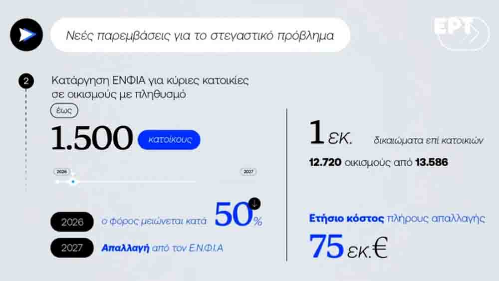 - Ενίσχυση της περιφέρειας, με την κατάργηση του ΕΝΦΙΑ για περιοχές με έως 1.500 κατοίκους (π.χ. αφορά σε Λέσβο, Σάμο, Κω, κ.ά.). Εδώ η λίστα με τους 12.720 οικισμούς που θα καταργηθεί ο ΕΝΦΙΑ μέσα στα επόμενα δύο χρόνια Επίσης, εισάγεται ενδιάμεσος συντελεστής στα ενοίκια 12.000- 24.000 ευρώ (π.χ. ο φόρος των 6.350 ευρώ μπορεί να μειωθεί στα 5.150 ευρώ), επεκτείνεται η απαλλαγή του φόρου για κενά ακίνητα που θα ενοικιαστούν, κ.λπ.